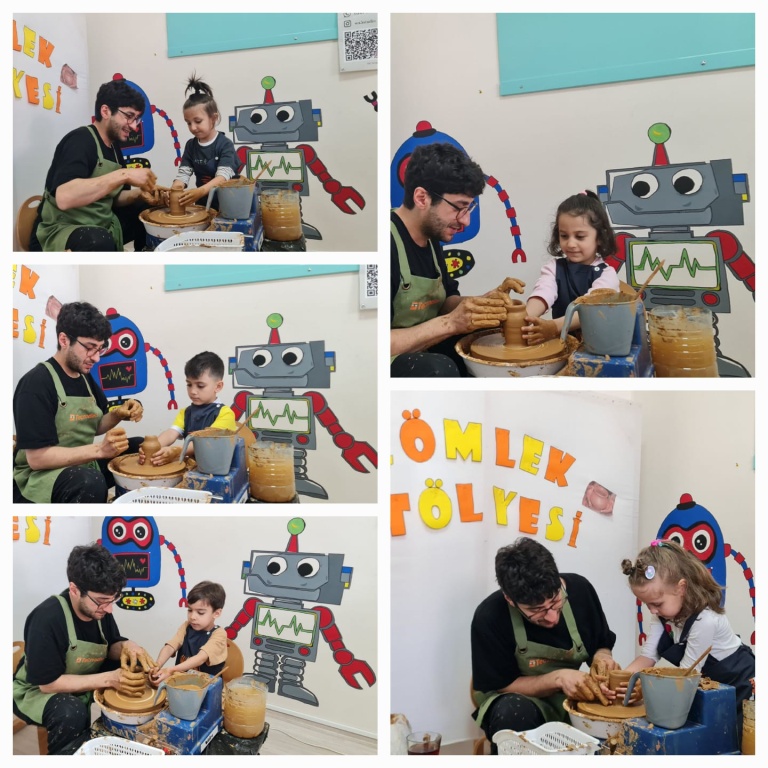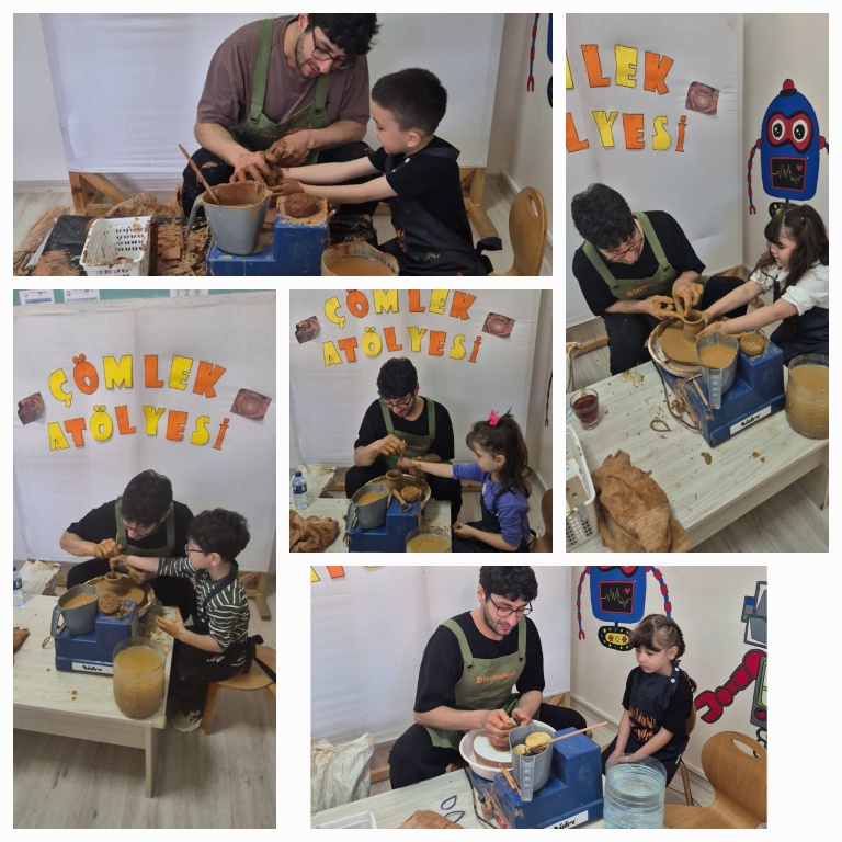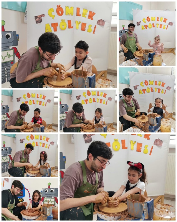 Okulumuzda çömlek tezgahı kurularak her çocuk kendi özgün ürününü oluşturdu.Oluşturulan ürünler anneler gününde annelere hediye edilmek üzere süslendi.